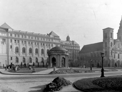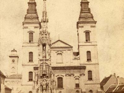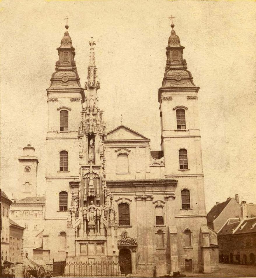 Az 1860-as évek közepetáján készült fotón a templomtól balra a kegyesrendiek (piaristák) régi rendháza (már nincs meg),