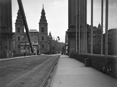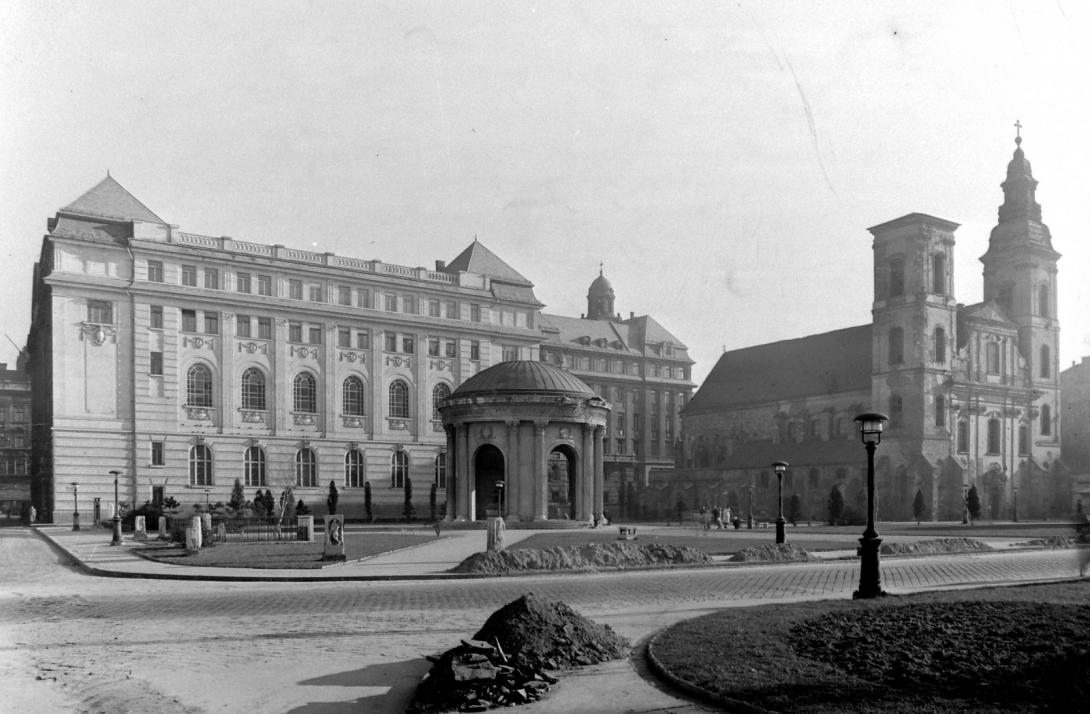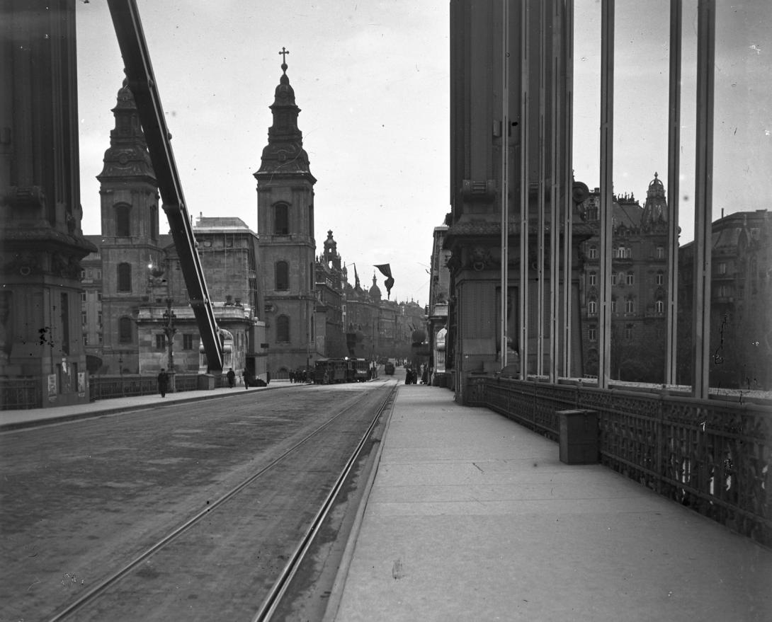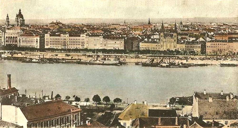 A  templomtól jobbra eső épület a régi belvárosi plébánia, az 1870-es évektől a városi tűzőrség központja  (már nincs meg) helyén az Erzsébet  híd.