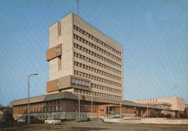 Pártház, ma irodaház a Tanács meg a, Dél-alföldi Regionális Közigazgatási Hivatal Bács-Kiskun Megyei kirendeltsége.
