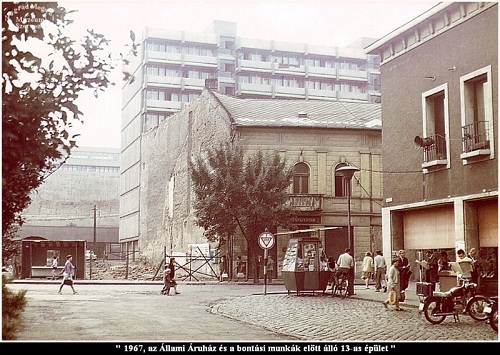 Az áruház a város főterén, a vasútállomás közelében áll. "Az áruházi igazgatás sűrűn váltakozó vezetőinek igényére az eredeti koncepció - nem előnyére - sokat változott és az építkezés elhúzódását eredményezte. Hagyományaink tárházában ilyen karakterű épület nehezen található. Az új utakat kereső, a korszerű képletből kiindult első terv a bírálóbizottság tagjai zömének a tetszését - akkortájt - nyilvánvalóan nem nyerhette el, ezért vált szükségessé az áttervezés. A második átdolgozott tervre viszont a stílusáramlatok negatív jegyeit próbálták alkalmazni." Vass Antal